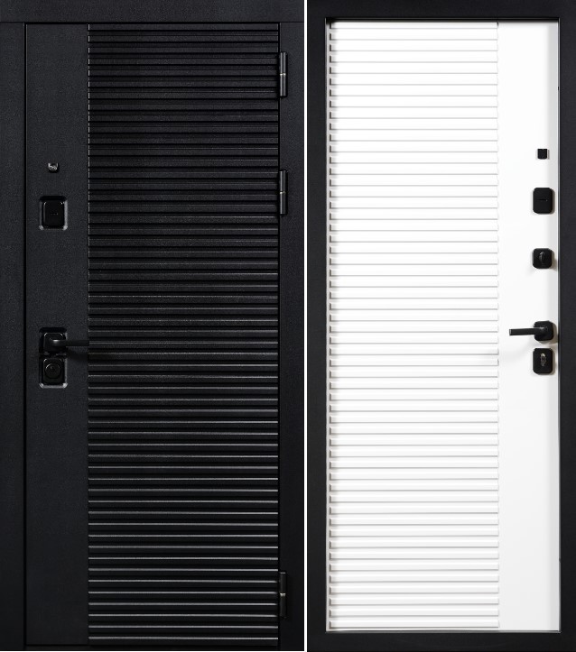 Сувальдный замок KALE 257 накладки Fuaro BL24. Цилиндровый замок KALE 252R, броненакладка BL42. Цилиндр VELA хром. Ручка FUARO квадрат черная. Глазок в замковой зоне. Независимая ночная задвижка. Механизм регулировки притвора. Противосъемные ригели, 2 шт. Петли на упорных подшипниках, 3 шт.